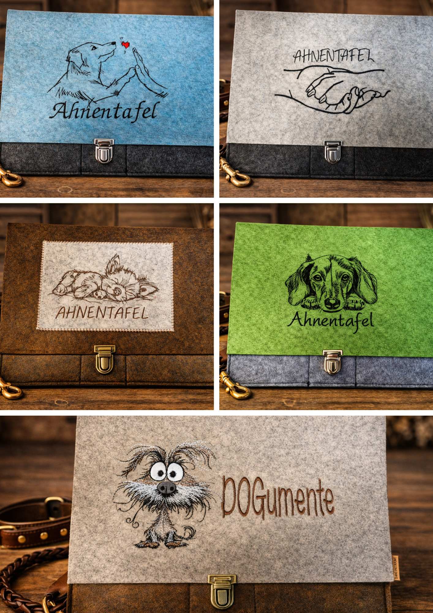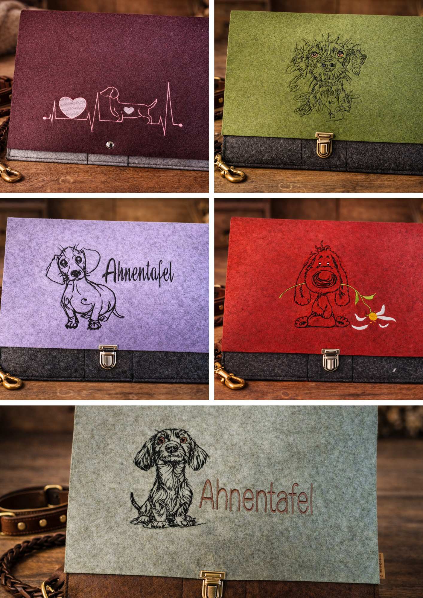Die Mappen für die Ahnentafeln werden aus Filz gefertigt und haben ein Fach für die Ahnentafel, den Impfpass, z.B. die Vorführleine, Notizen und Stifte. Auch hier kann das Stickmotiv frei gewählt werden. (z.B. mit Zwingernamen).
